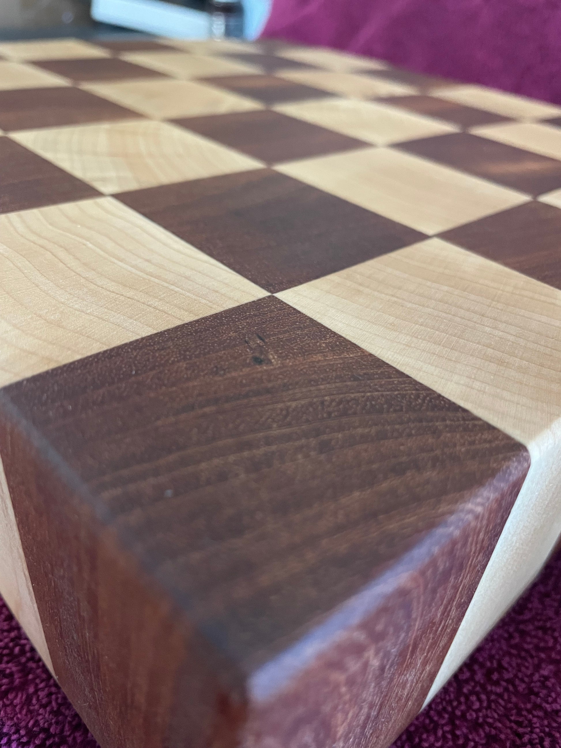 This End Grain cutting board features Rock Maple and African Mahogany (Sapele) and measures approximately 12" x 12" and a hefty 2.75" thick. This board will last a lifetime of bands in business suits and working out every day.